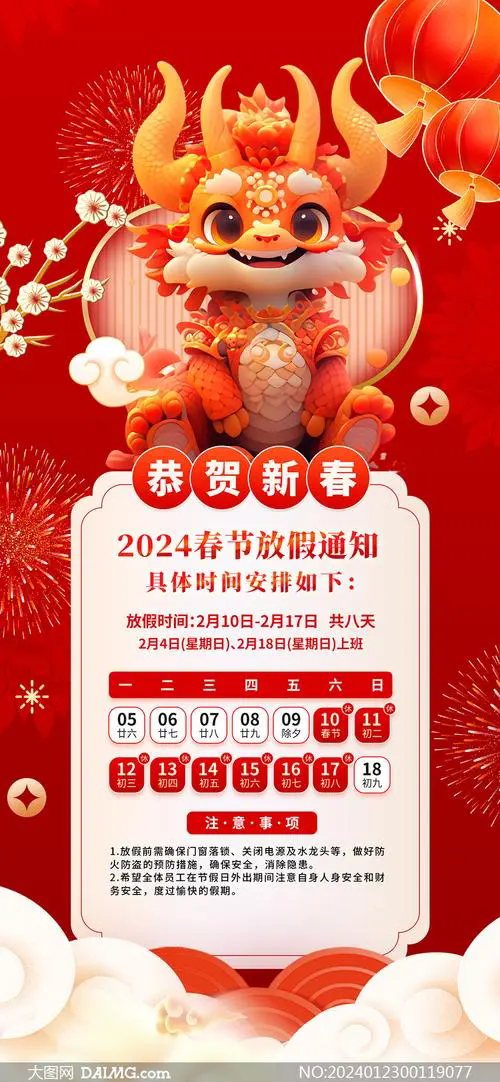 根據(jù)《國務院辦公廳關于2024年部分節(jié)假日安排的通知》,2月10日至17日放假調(diào)休,共8天。2月4日(星期日)、2月18日(星期日)上班。鼓勵各單位結合帶薪年休假等制度落實,安排除夕正式放假(2月9日)休息。停止發(fā)貨時間為2月3號。請各部門做好安全檢查,相關工作安排和處理。